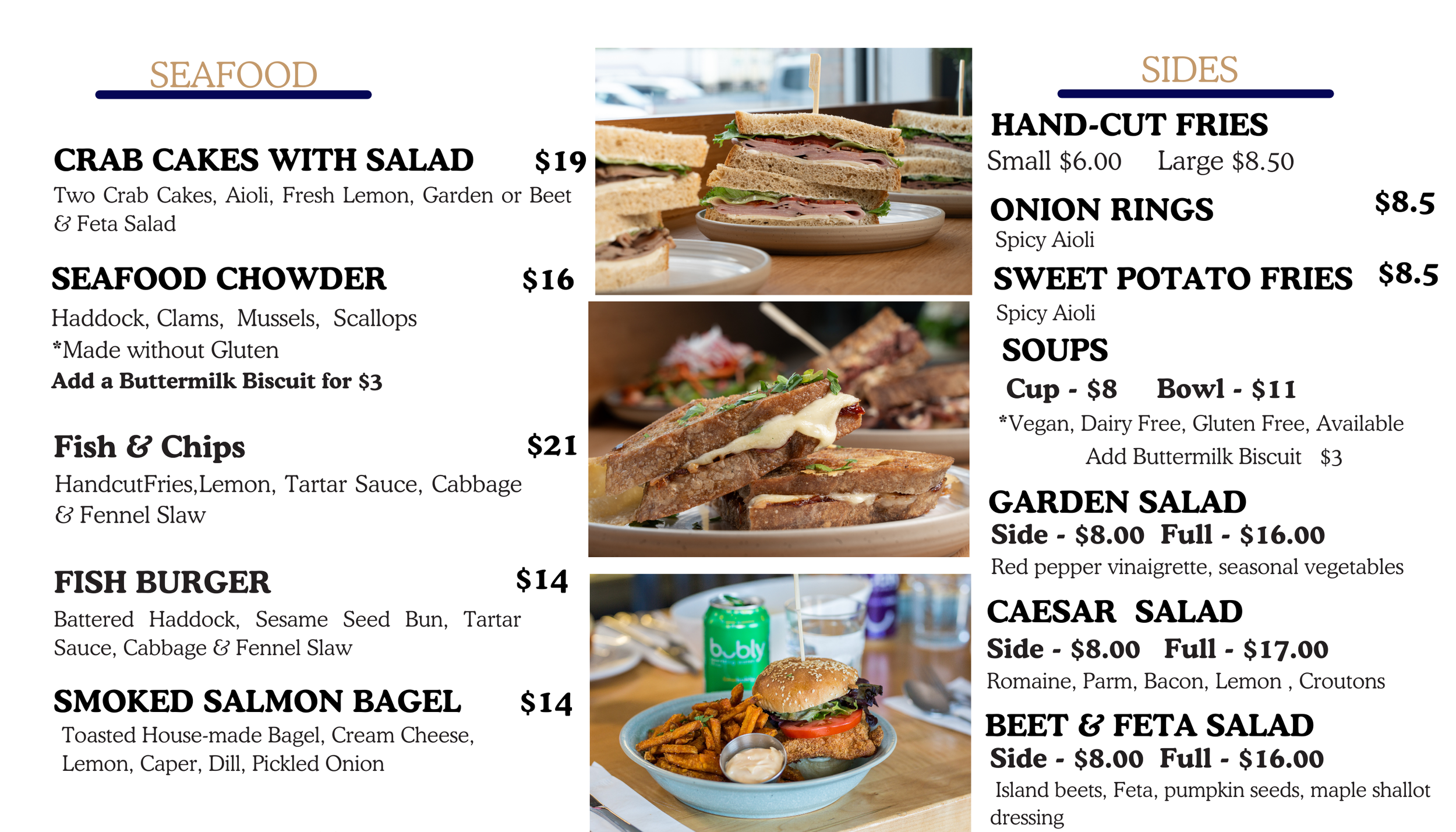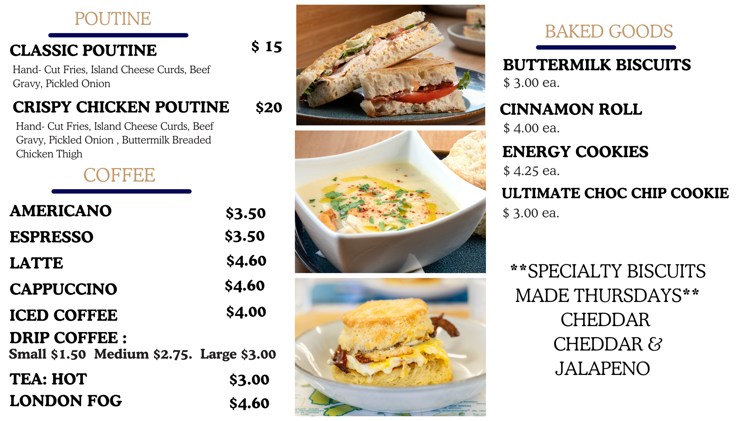 Perfect for a home cooked meal without the prep, if you need to pick up food for a parent, friend, family, we have all kinds of options for you. Homemade soups, chowder, biscuits, crab cakes, mac N’ cheese, dips, salads, desserts and more!